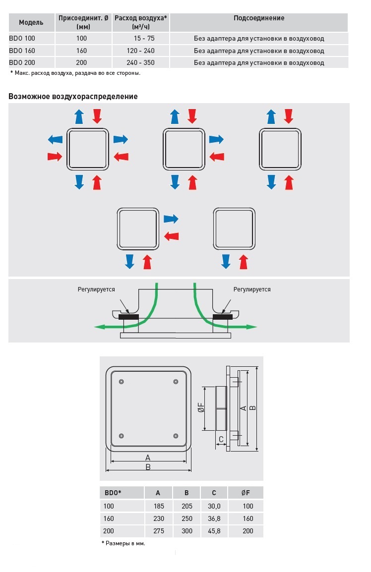 При использовании в приточных системах возможна настройка направления и длины струи.