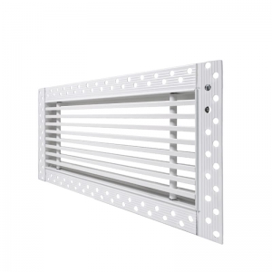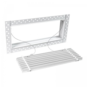 Данная решетка подходит для монтажа на любую поверхность под финишную отделку. Рамка и экран изготовлены из алюминия, опора экрана - из оцинкованной стали. Рама оснащена «полкой» 1,9 мм и рифлеными краями для большей адгезии финишного материала – шпатлевки, цемента. Решетка имеет съемную центральную часть с фиксированным углом наклона ламелей 0°. Она крепится к корпусу прочными металлическими тросиками, легко снимается для очистки и удобного обслуживания.