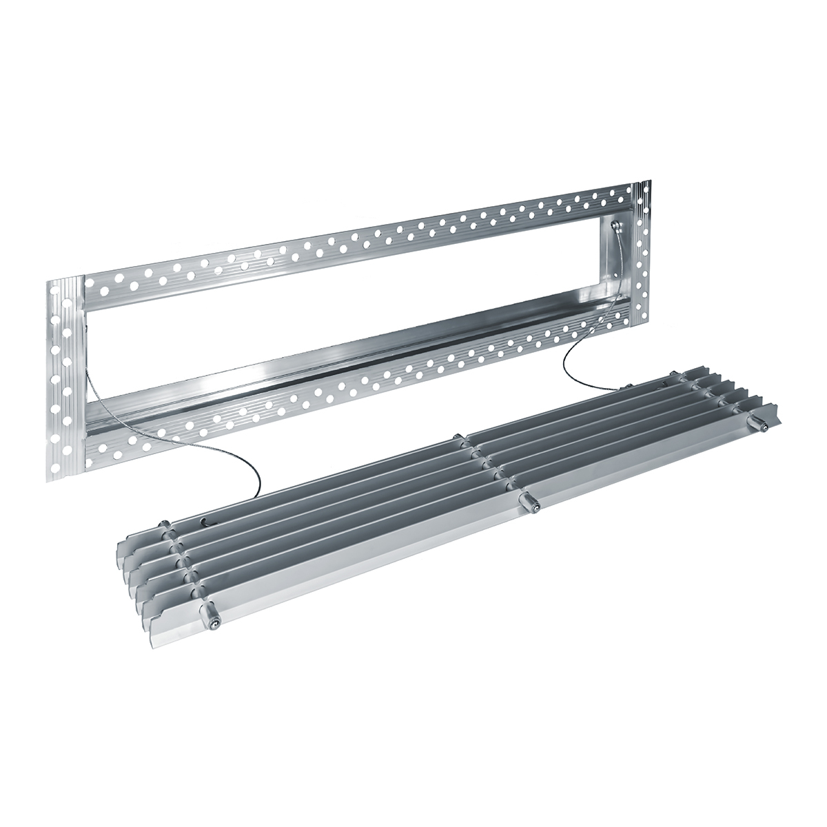 Данная решетка подходит для монтажа на любую поверхность под финишную отделку. Рамка и экран изготовлены из алюминия, опора экрана - из оцинкованной стали. Рама оснащена «полкой» 1,9 мм и рифлеными краями для большей адгезии финишного материала – шпатлевки, цемента. Решетка имеет съемную центральную часть с фиксированным углом наклона ламелей 15°. Она крепится к корпусу прочными металлическими тросиками, легко снимается для очистки и удобного обслуживания.