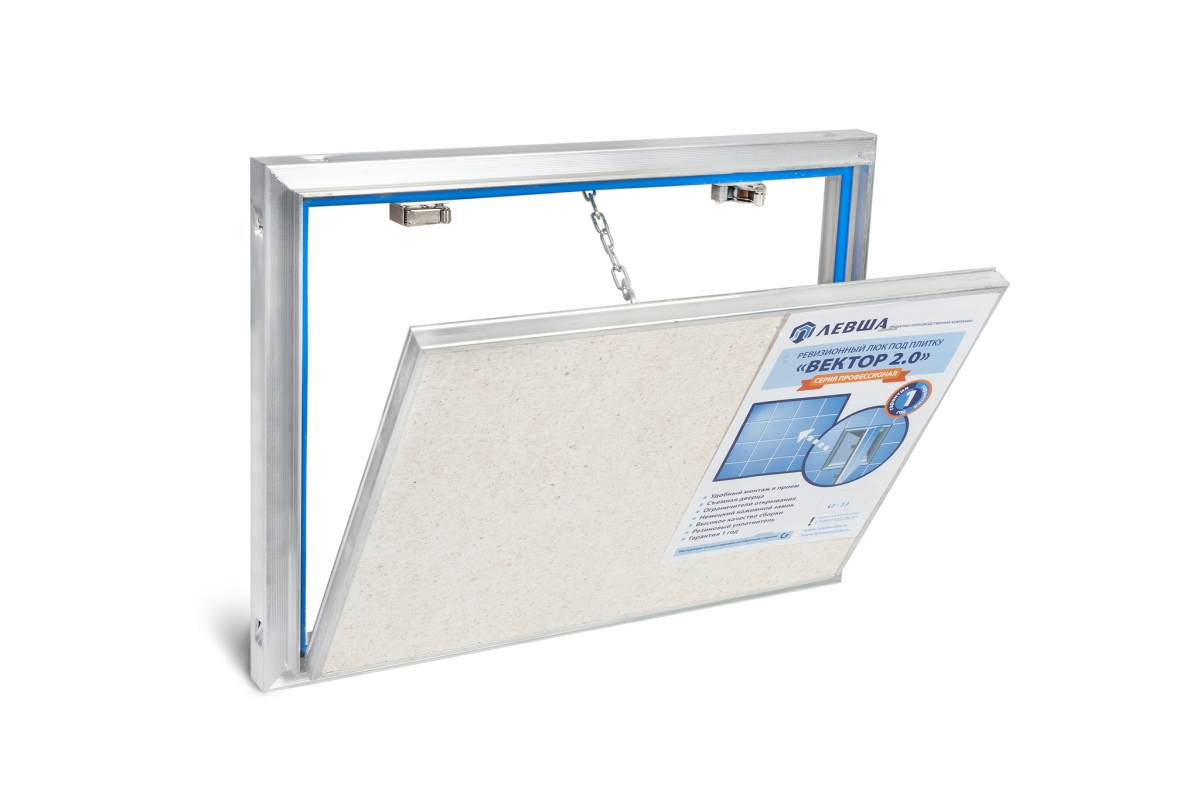 Люк под плитку «ВЕКТОР 2.0» повышенной прочности и жесткости с откидной, съемной дверцей, на которую наклеится абсолютно любые листовые отделочные материалы (керамическая плитка, керамогранит, натуральный или искусственный камень, различные композитные материалы и др.).