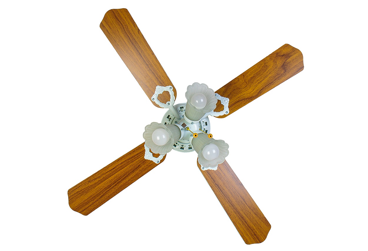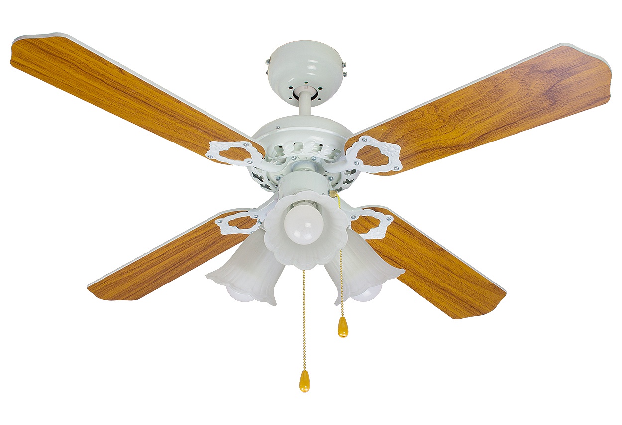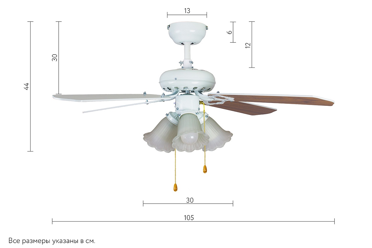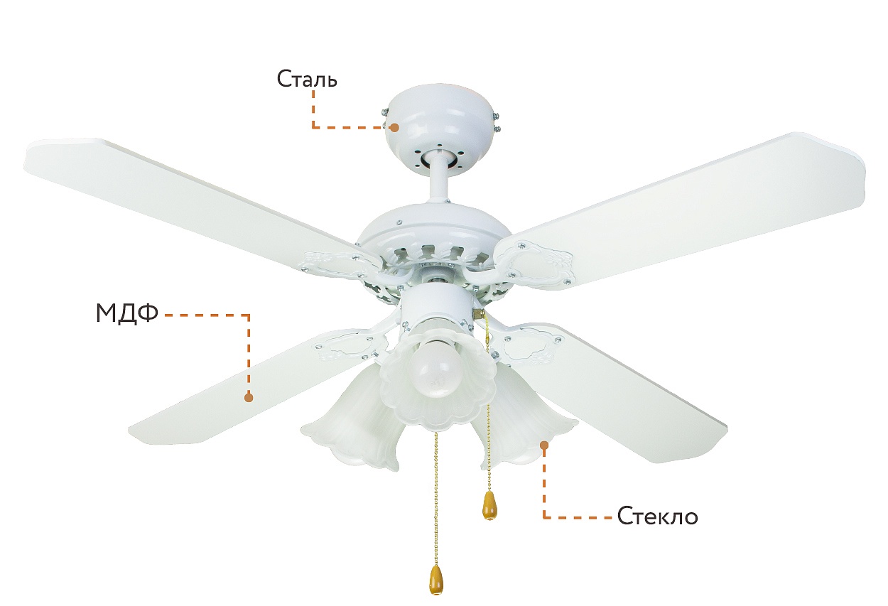 Устройство:С помощью шнура-переключателя производится переключение скоростей между тремя возможными. Второй шнур-переключатель предназначен для включения/выключения световой части вентилятора, состоящей из светильника на 3 лампы E14. Мощность каждой лампы не должна превышать 50 Вт.