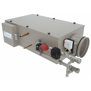 Приточная установка с фреоновым охладителем, водяным нагревателем и смесительным узлом с 2-х или 3-х ходовым клапаном (узел подбирается исходя из типа водоснабжения), комплектуется воздушным клапаном с электроприводом (с возвратной пружиной), системой цифровой автоматики JetLogic с цветным сенсорным пультом управления и всеми необходимыми датчиками. Автоматика может управлять различными типами ККБ. Вентилятор Ebmpapst серии EC (произведен в Германии).
