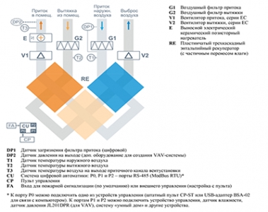 ОписаниеПриточно-вытяжная установка с трехкаскадным энтальпийным рекуператором (с переносом влаги) и электрическим нагревателем, комплектуется системой цифровой автоматики JetLogic с цветным сенсорным пультом управления и всеми необходимыми датчиками. Вентиляторы Ebmpapst серии EC (произведены в Германии).Внимание: воздушные клапаны с приводом не входят в комплект и могут поставляться опционально; относительная влажность вытяжного воздуха в холодный период года не должна превышать 40%.Функции автоматики
