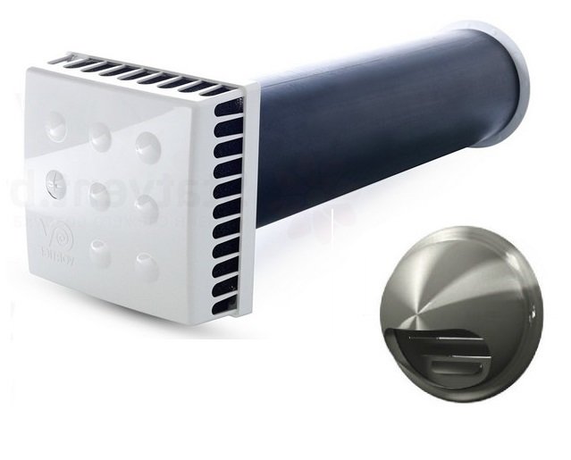 Приточный клапан состоит из пластиковой трубы диаметром 132 мм и длиной до 1000 мм, которая устанавливается в наружную стену здания. Предварительно трубу подразают по толщине стены. Со стороны улицы отверстие закрывается алюминиевой решеткой с сеткой или выходом стенным из нержавейки, которые задерживают листву, насекомых, тополиный пух.