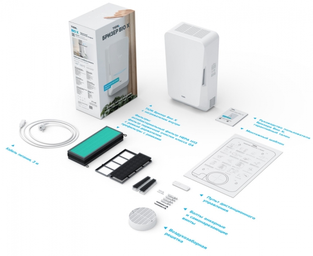 Настенная приточная установка Tion (Тион) BioX Base обеспечивает приток свежего воздуха с улицы и его очистку. Комбинация нескольких фильтров позволяет удалять почти всех известные загрязнители - от крупных частиц пыли до мелкодисперсных частиц, бактерий и вирусов. Для управления доступен беспроводной пульт и приложение на смартфоне.