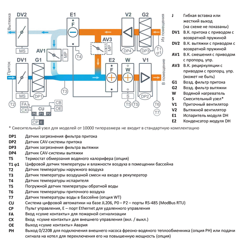 - Возможные опции PH нагрев воды в бассейне WT температура воздуха по температуре воды PW дополнительный водяной калорифер CF дополнительный охладитель и управление ККБ CH переключение тепло-холод CE выносной конденсатор и переключение тепло-холод DS диспетчеризация.