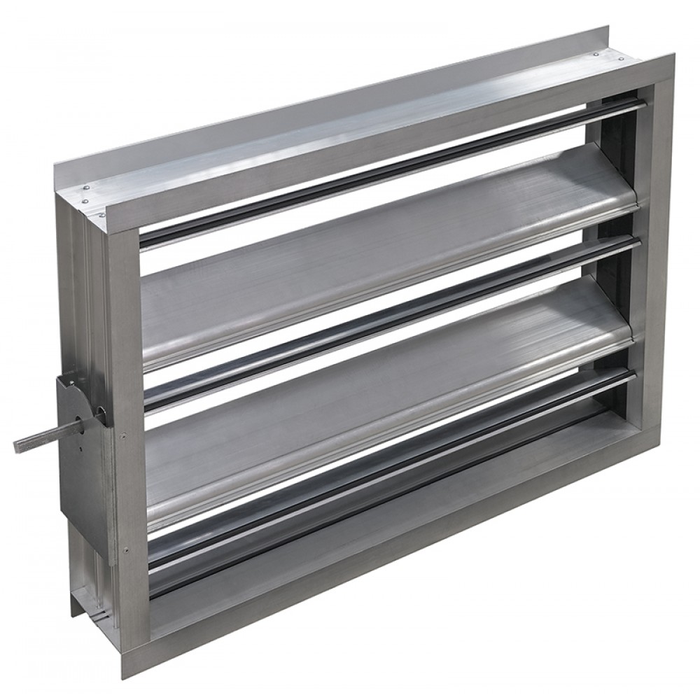 Клапан состоит из прямоугольного корпуса и установленных в него жалюзи, которые через систему зубчатых колес поворачиваются на требуемый угол. В качестве материала для изготовления корпуса и жалюзи применяются соответствующие алюминиевые профили.